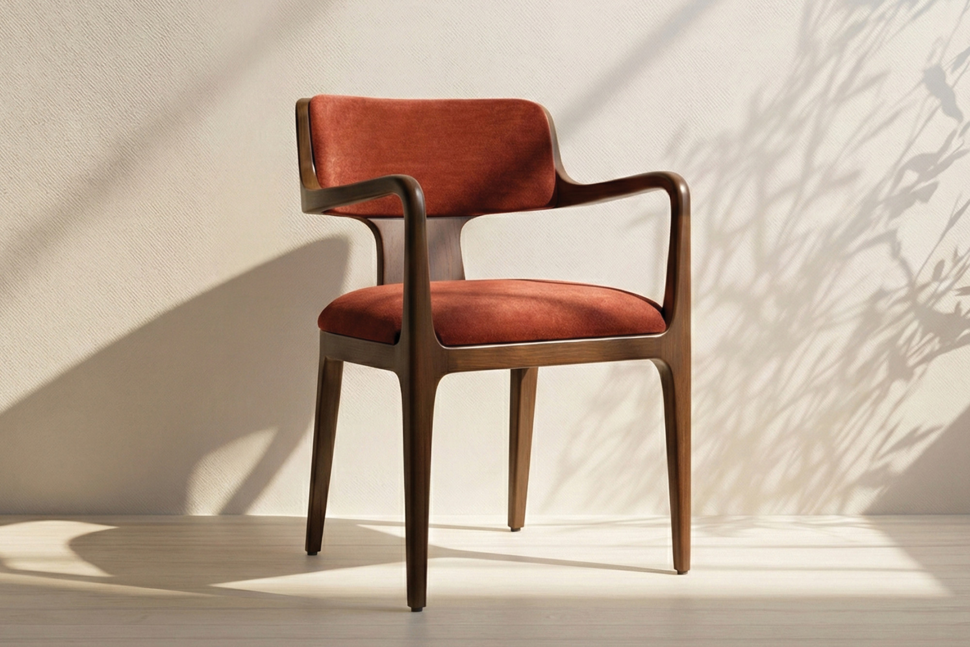The Burgundy Armchair is a masterclass in modern elegance — featuring fluid lines and a sculptural silhouette. Handcrafted using solid Burma teak, the backrest flows effortlessly into the armrests in a single, continuous curve, showcasing expert craftsmanship and a minimalist aesthetic. Compact and ergonomic in equal measure, this armchair would also work perfectly as a dramatic dining chair.