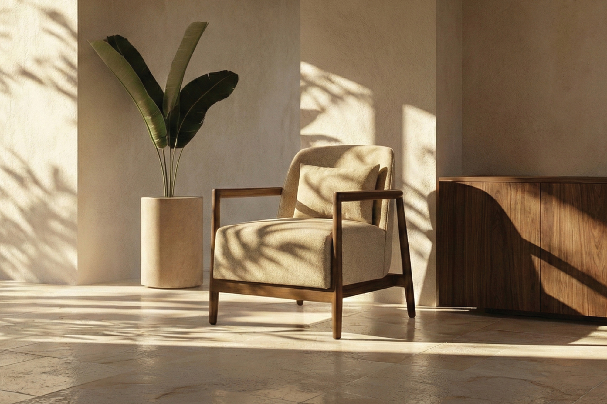 The Calcutta Armchair is handcrafted primarily from premium Burma teak wood, supplemented by marine ply. It includes a matching rectangular lumbar pillow for added ergonomic support. The chair is upholstered in a textured bouclé fabric, which adds a layer of softness and visual depth to the piece — but you can choose from several upholstery and polish options to make this armchair uniquely suited to your interiors.