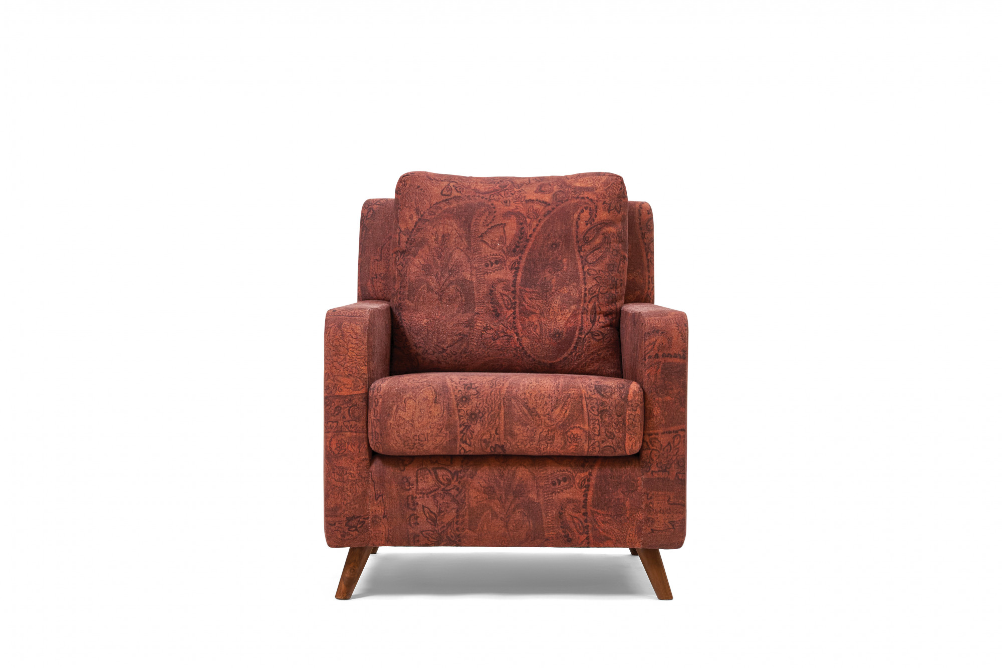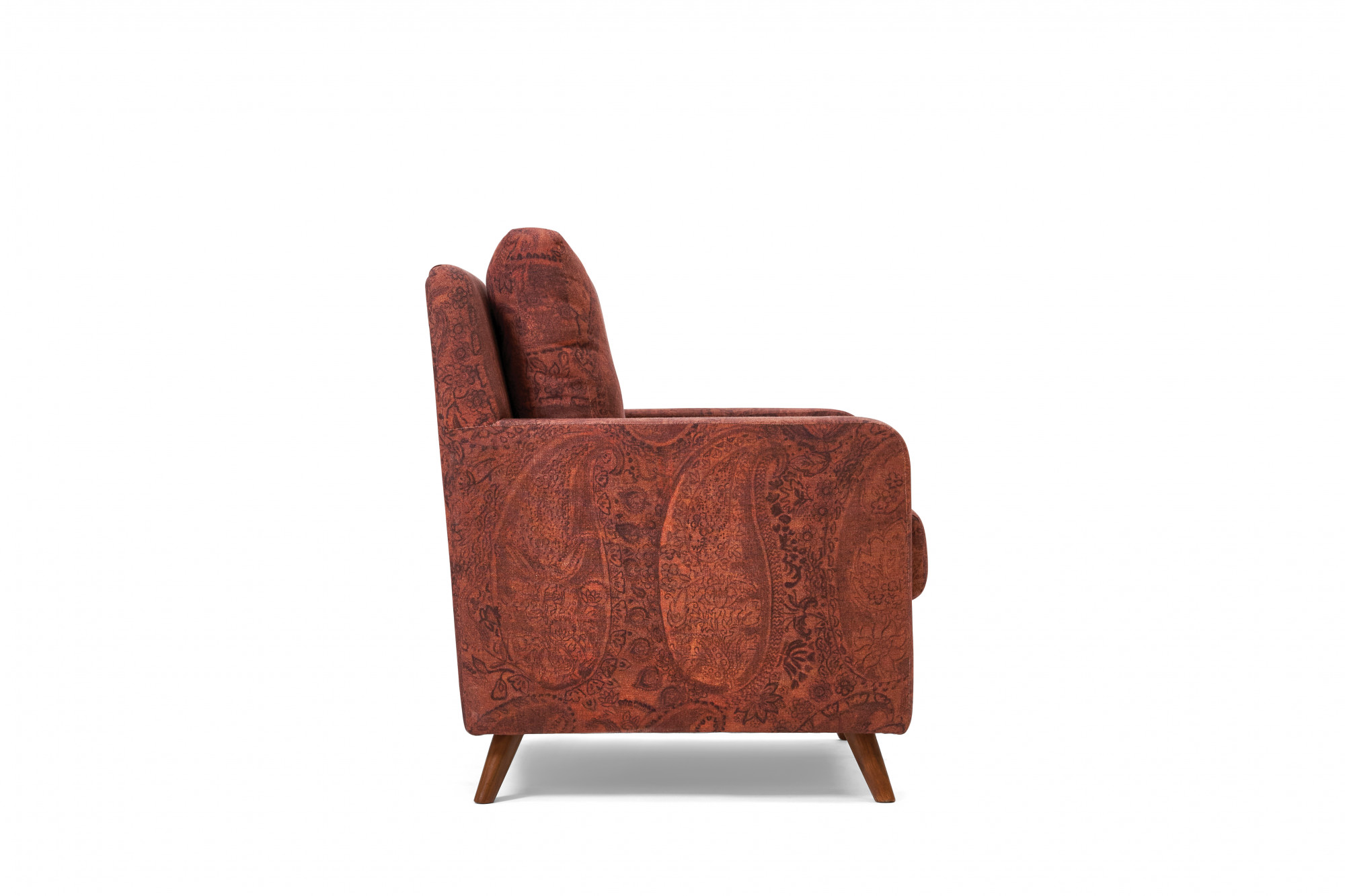 The Elly Armchair features a classic mid-century modern profile, in a compact package. Generously upholstered, with a thick seat cushion and high backrest, it is supported by elegant Burma teak wood tapered legs that angle outward — bringing a lightness and balance to its solid form. Rounded armrests soften this charming armchair further, making it an ideal choice for urban apartments and cosy reading nooks.