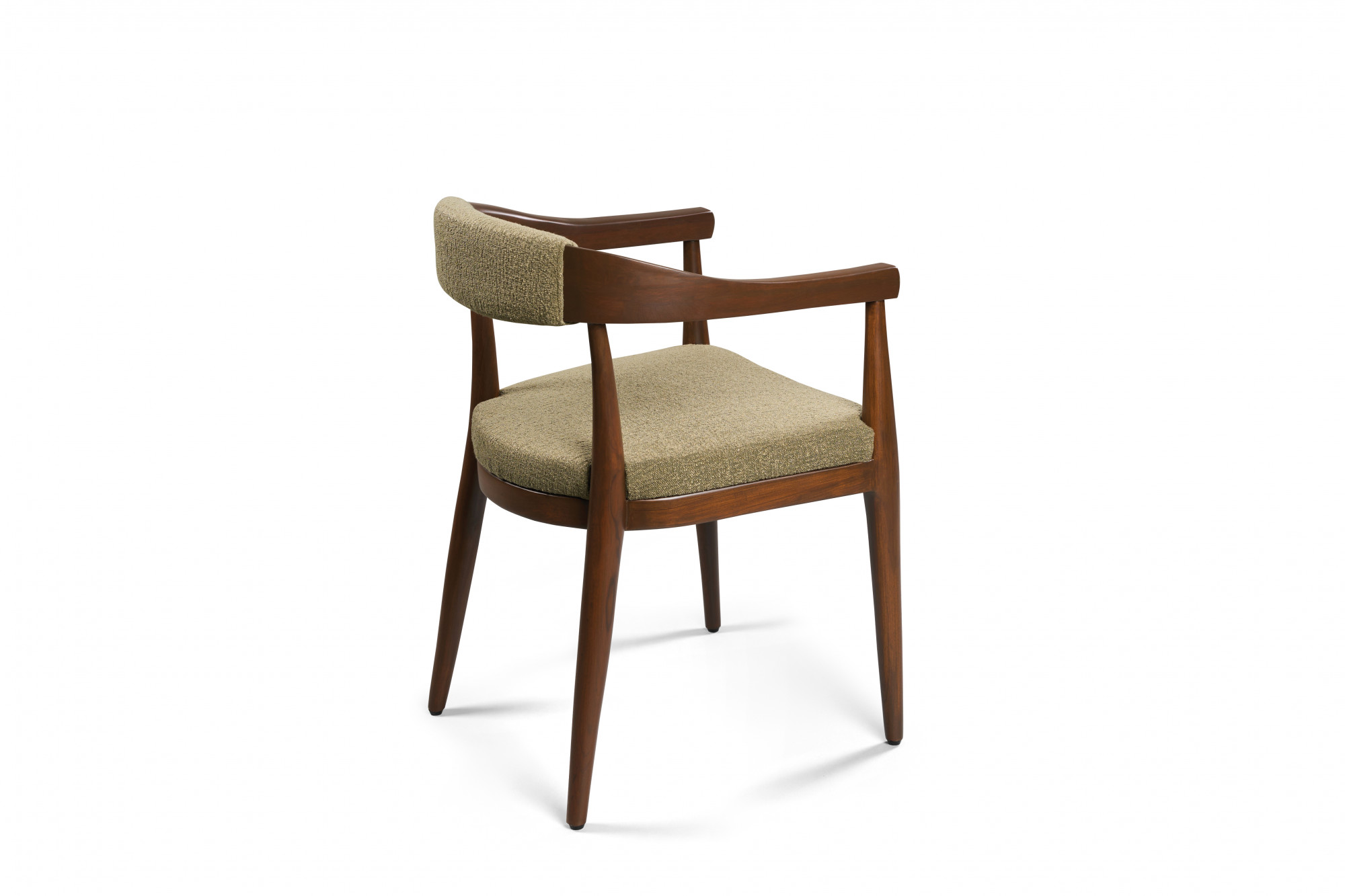 Clean lines and a sense of openness characterise the Fiji Armchair. With its exposed solid Burma teak wood frame, this piece has striking sculptural beauty. A distinctive, continuous curved backrest flows seamlessly into the armrests — creating a smooth, organic silhouette that is both ergonomic and dramatic. The chair stands on slim, rounded legs that subtly taper toward the floor, providing a sturdy yet lightweight appearance. This compact, comfortable armchair is also suitable for use as a dining chair.