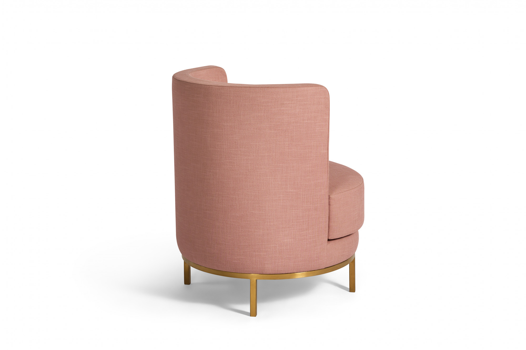 Plush comfort meets polished shine in this generous armchair. Featuring a high back and round body, this piece is defined by its glistening metal base and legs.