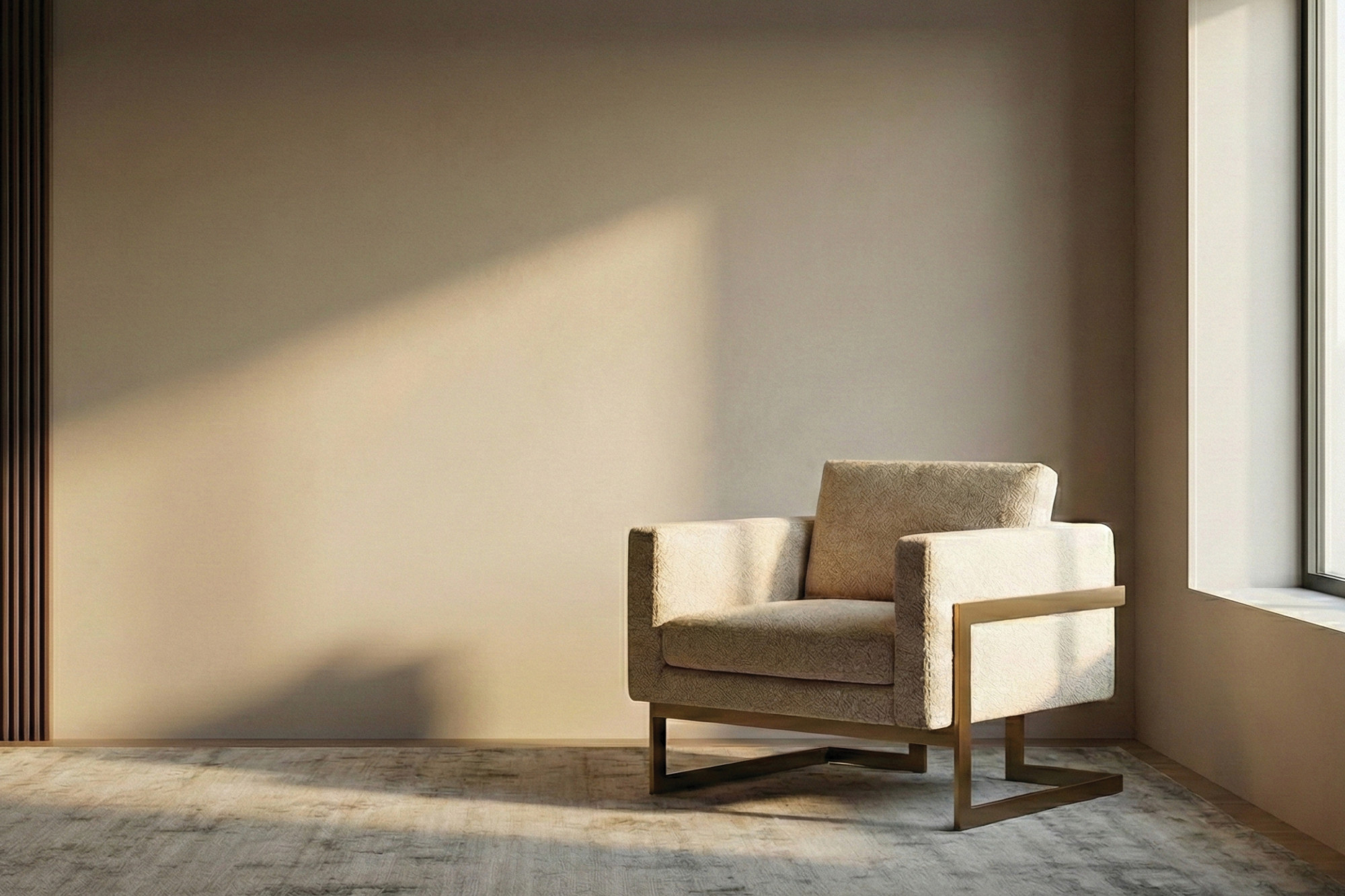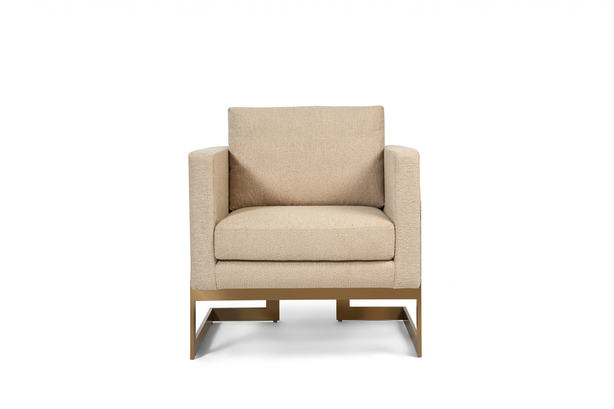 The Perth Armchair features a bold, geometric cantilevered base crafted from stainless steel, with a warm, brushed gold finish. The continuous lines of the frame wrap around the chair’s upholstered body, creating a cradle with a floating effect — giving its boxy construction lightness and sophistication. With a rear profile that is just as detailed as the front, this armchair is an excellent choice for open-plan rooms, where it is visible from all angles.