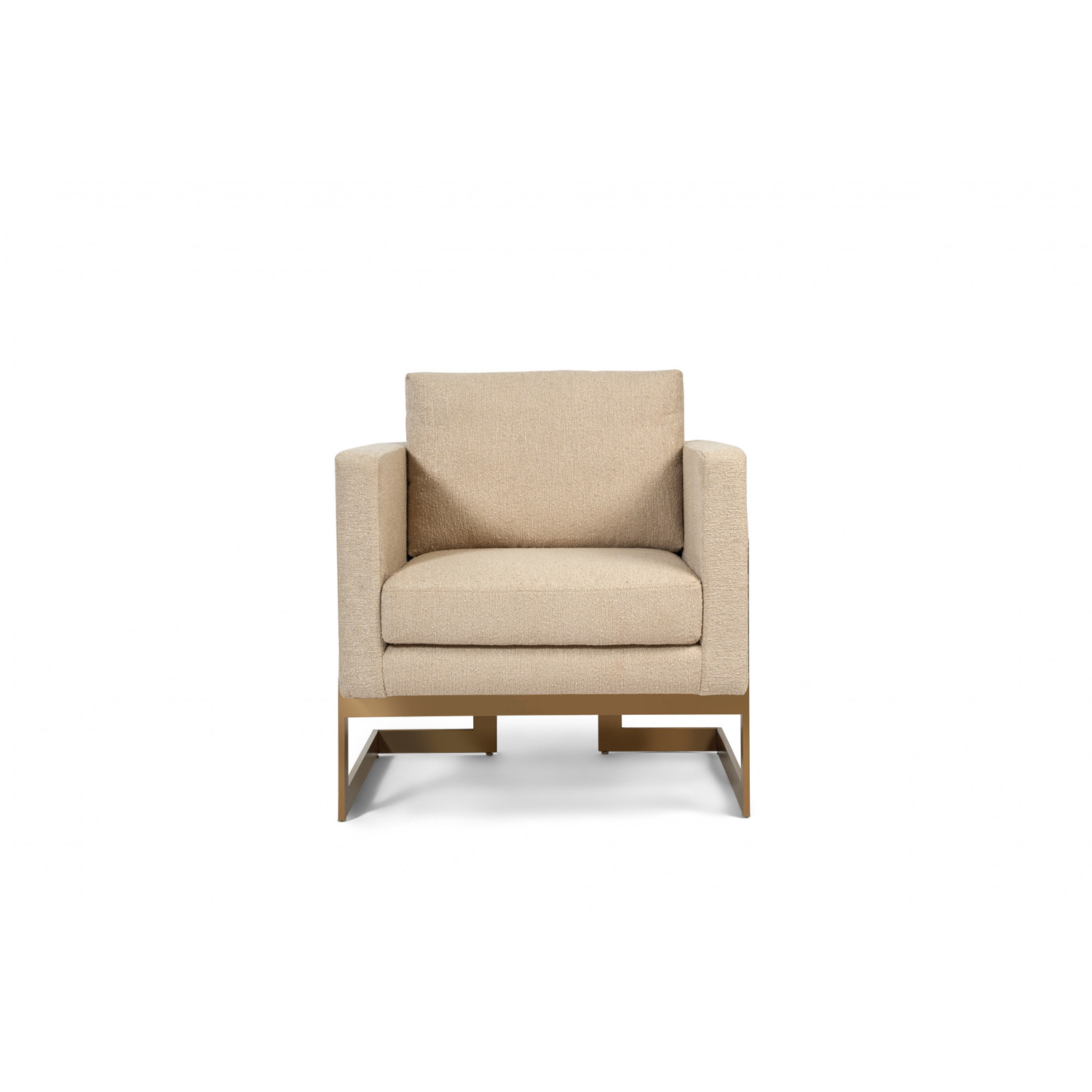 The Perth Armchair features a stainless-steel cradle in a brushed gold finish. Its internal frame is made using teak wood and marine ply. The seat is made of polyurethane foam, resting on Italian elastic bands. Choose from a variety of upholstery options to complement your interiors. A loose polyfill cushion is included.